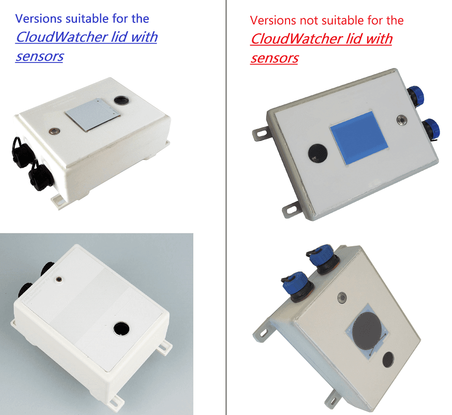|  Tapa actual, con superficie de detección de lluvia ampliada, sensor de infrarrojo (IR) y filtro dicroico UV-IR. |  Tapa antigua, con sensor de lluvia pequeño, sensor de infrarrojo IR y ventana de metacrilato. ¡DESCATALOGADO! |
